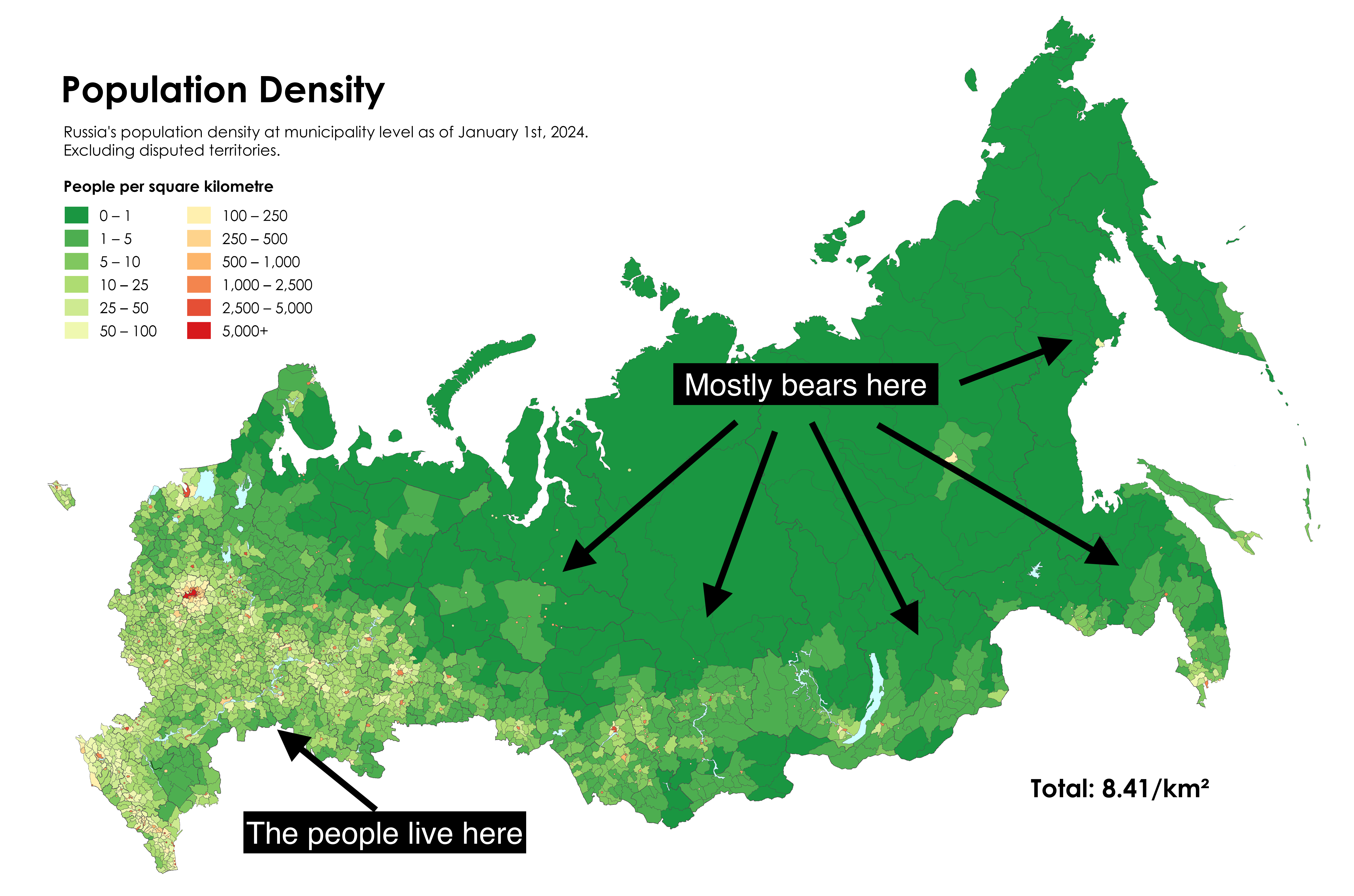 Over three quarters of Russia’s territory is in Asia, but conversely, roughly the same proportion of its population live in its European lands. That’s a feature, not a bug.